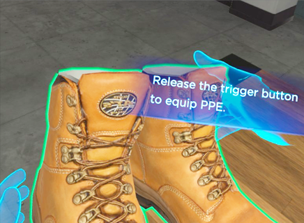 An immersive VR module that trains technicians to properly select and equip PPE in a realistic digital twin of a datacenter changing room.